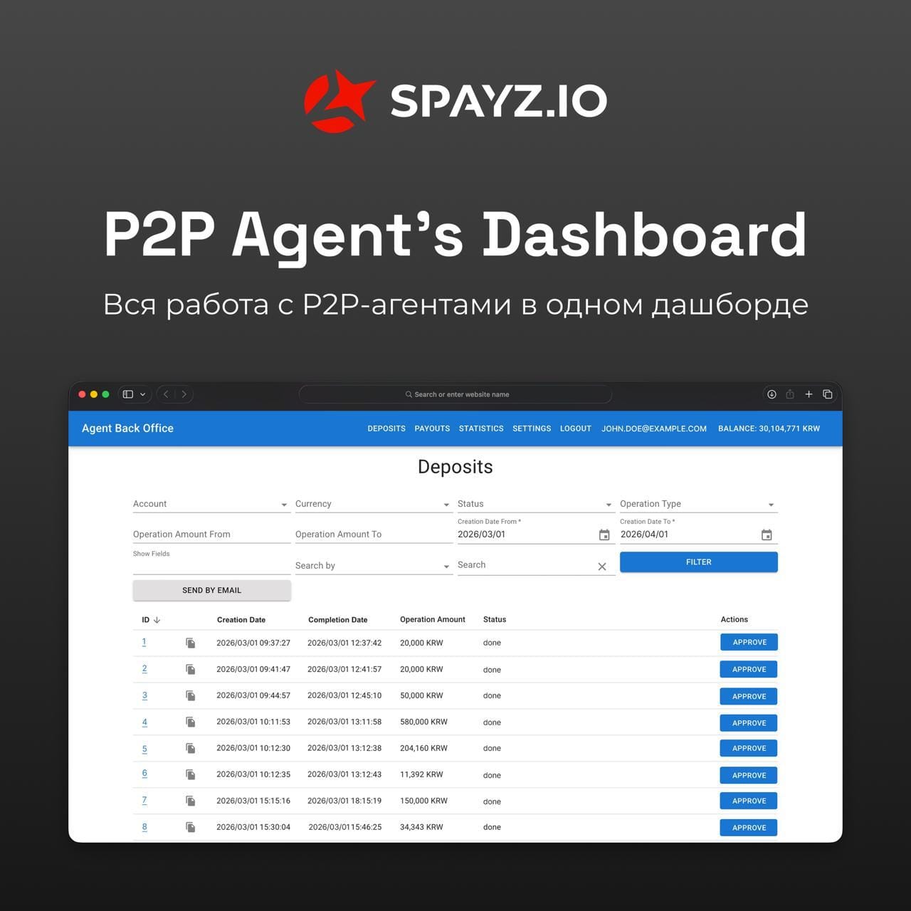 😁 P2P Agent’s Dashboard от SPAYZ.io — платформа для тех, у кого агентская сеть уже есть, а автоматизированной системы ещё нет Зачем нужен дашборд? 🔴гоняете платежи через P2P-агентов 🔴ведёте операции в Excel/чатах/скриншотах 🔴вручную считаете комиссии и балансы 🔴сложно быстро понять, кто подтвердил транзакцию и какой у неё статус