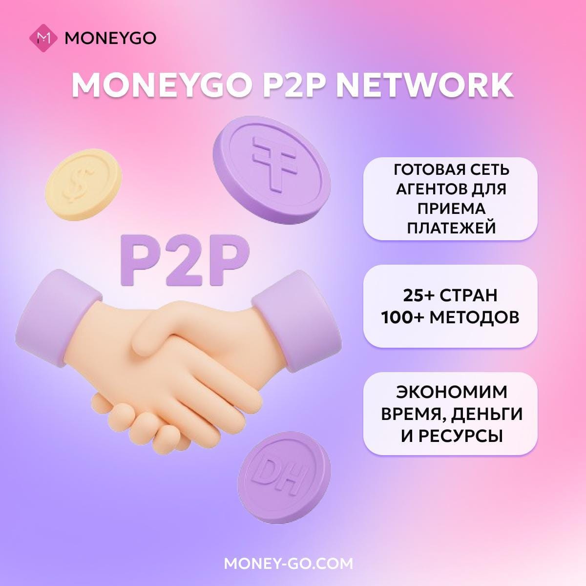 🌐 MoneyGo P2P Network - ваша собственная сеть агентов по приёму платежей без лишних затрат Платный Участники Публичный