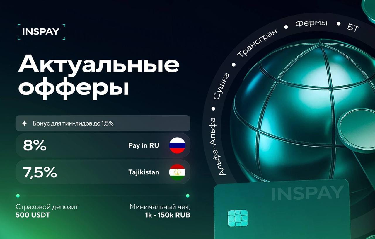 🚀 INSPAY открывает набор трейдеров Мы можем долго рассказывать о себе, но главное - гибкость. Мы быстро подстраиваемся под партнеров, честно ведем трафик и постоянно расширяем направление работы. 📍 Актуальные GEO: 🇹🇯Таджикистан — 7,5% 🇷🇺 Россия — 8% • Единый страховой депозит: $500 • Чеки: от 1 000 до 150 000 RUB Почему с нами удобно